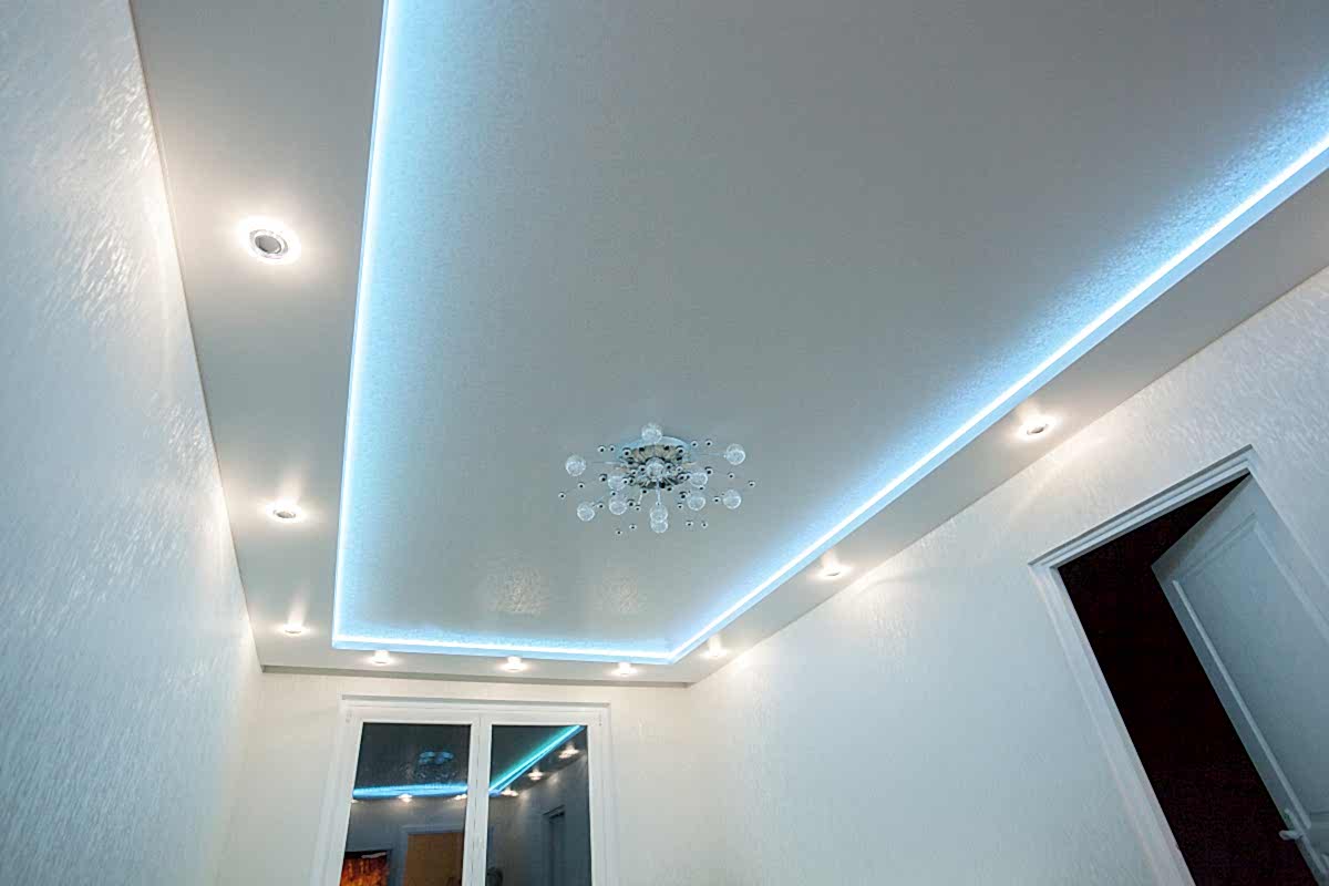 Двухуровневые натяжные потолки как правило, но не обязательно создаются из контрастных материалов. Это может быть разница в цвете (черный и белый или белый и красный) или в фактурах (матовая и глянцевая). Чтобы выбрать подходящее сочетание, вызывайте на дом замерщика, он подскажет, какой двухуровневый потолок будет лучше!
